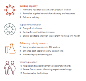 Nel 2020 Il gruppo di lavoro del progetto PHASES (Pregnancy + HIV/AIDS: Seeking Equitable Study) [14] dedicato alla ricerca con le donne in gravidanza con HIV/AIDS in Ending the evidence gap for pregnant women around HIV & co-infections [15], ha formulato 12 raccomandazioni. (Immagine 1) per l’inclusione delle donne in gravidanza negli studi, nello specifico studi su HIV/AIDS.
